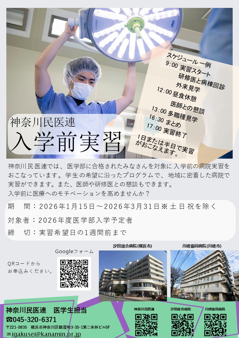 神奈川民医連では、医学部進学予定者(合格者)を対象に、病院での「入学前実習」の受け入れをおこなっています。